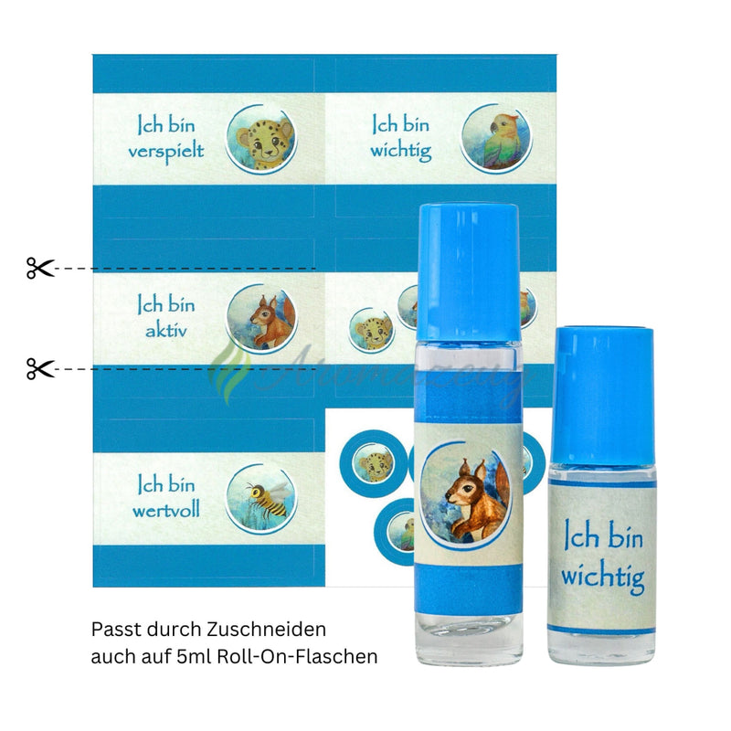 Ein Aufkleberbogen enthält 5 x Aufkleber für 10ml Roll-On Flaschen & 5 x Deckel Aufkleber. Die hochwertigen Aufkleber lassen sich leicht anbringen und sorgen für eine stilvolle und funktionale Beschriftung. Perfekt für die tägliche Routine, um Kinder spielerisch an die Welt der Affirmationen und ätherischen Öle heranzuführen.